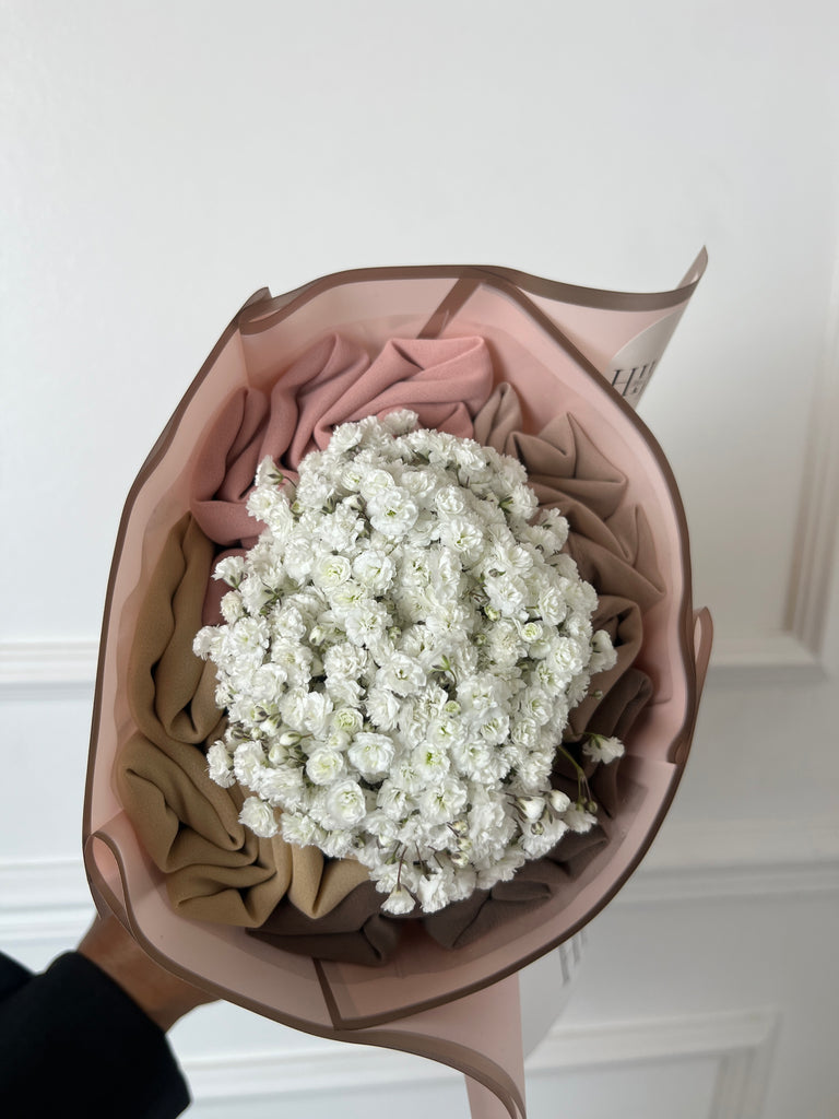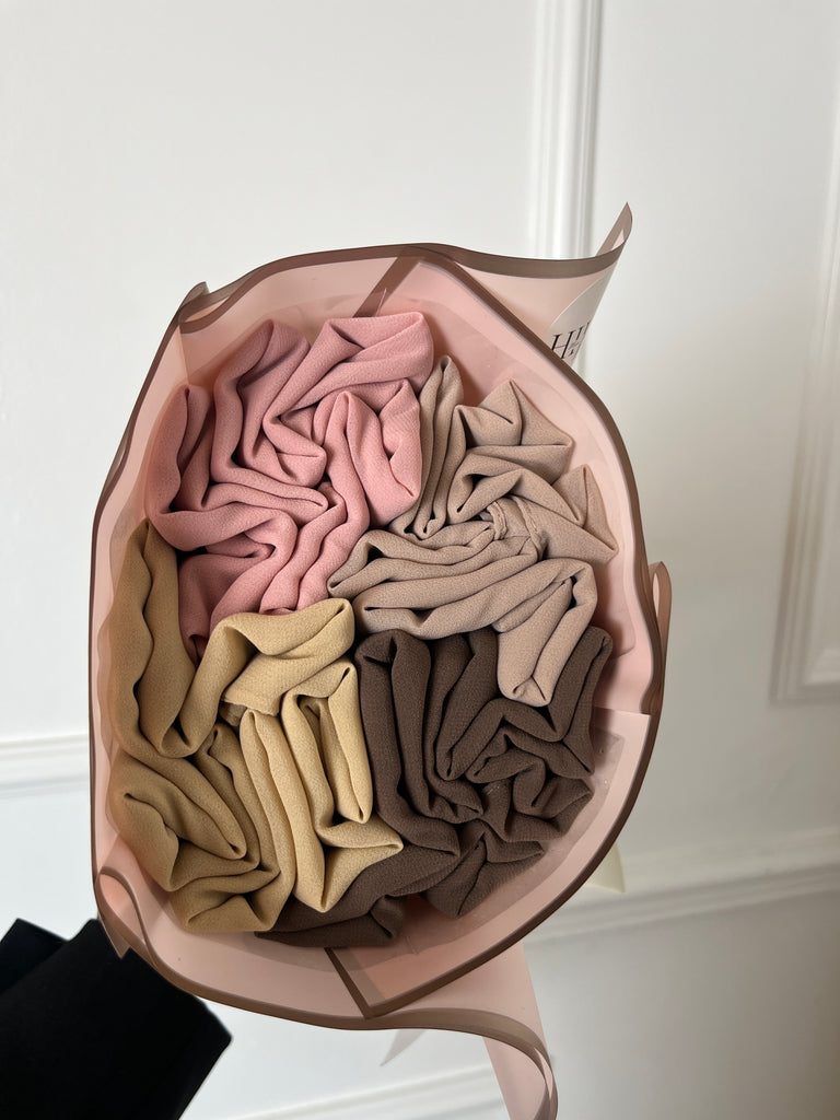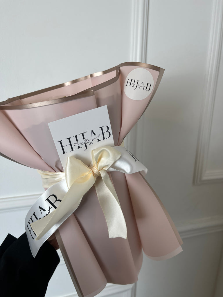 Sublime bouquet hijab avec son emballage rose composé de 4 Hijabs mousseline et gypsophile fraîches.